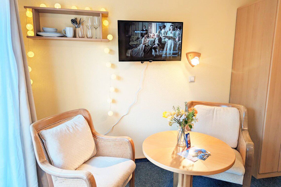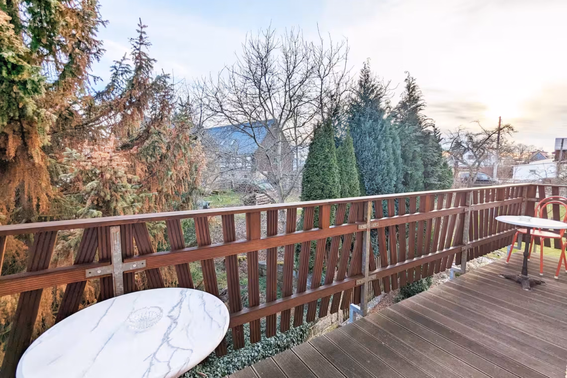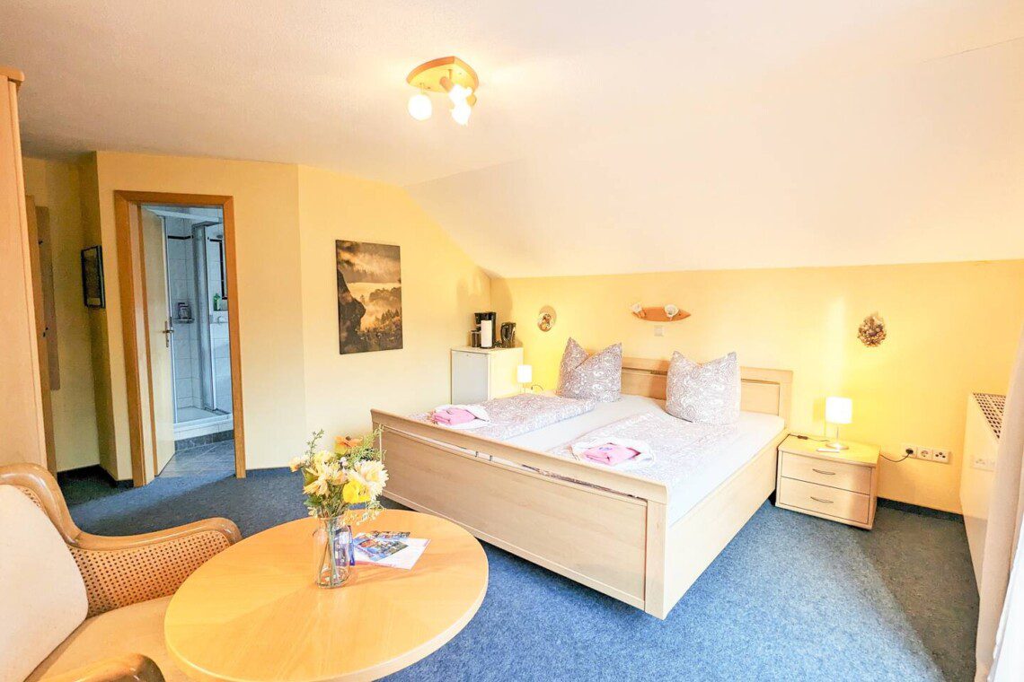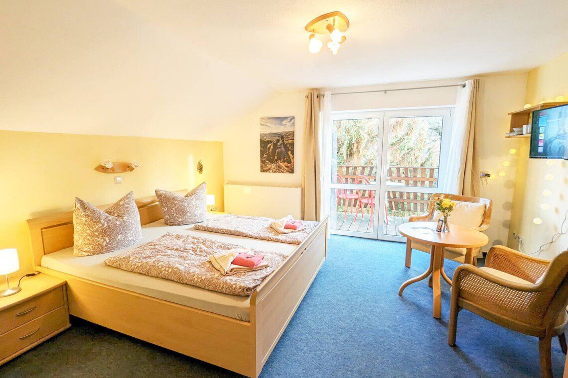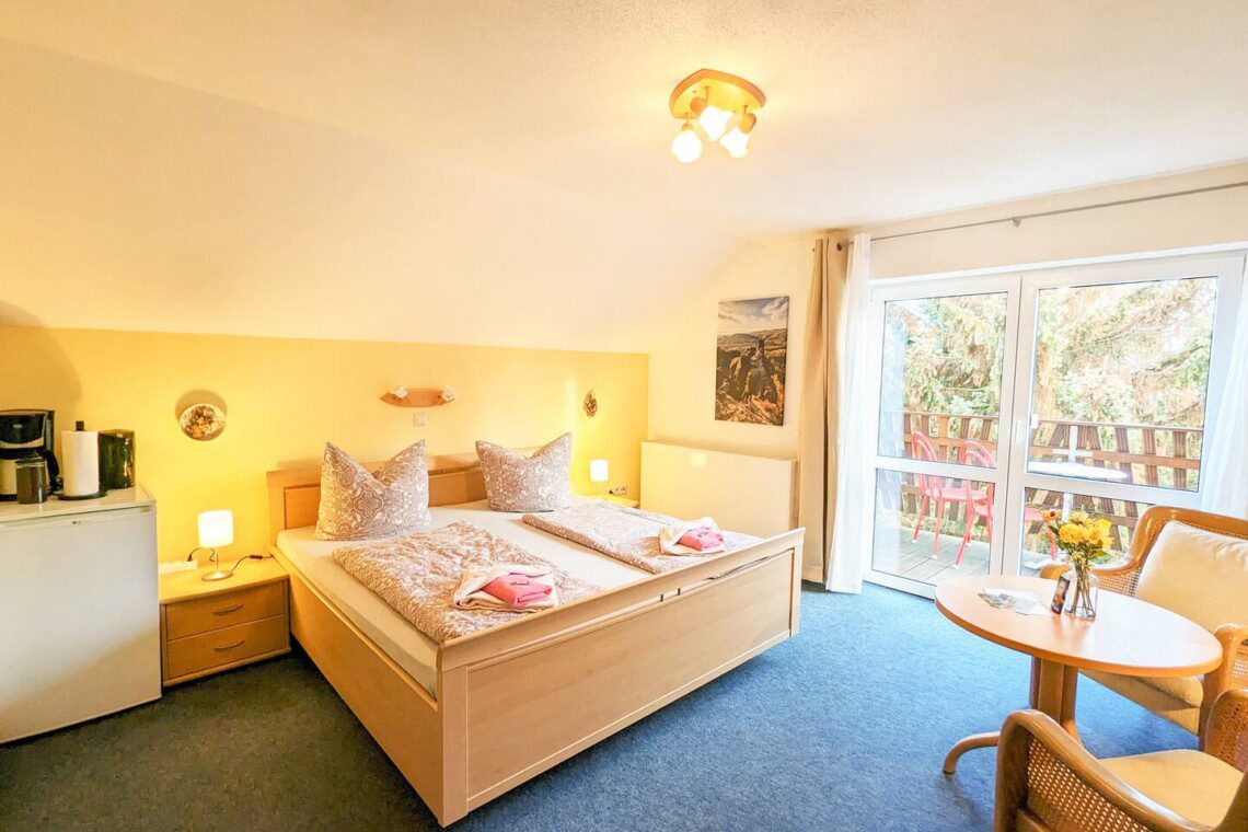 Dein gemütliches Zimmer mit eigenem Balkon und Bad bietet dir alles für einen entspannten Aufenthalt. Es gibt keine Küche, doch ein Kühlschrank hält Getränke und Snacks kühl, und mit Kaffeemaschine und Toaster kannst du dein Frühstück bequem im Zimmer zubereiten. Im Sommer lädt die Gemeinschaftsterrasse vor dem Haus zum Grillen ein. Von der Unterkunft aus kannst du direkt zu Wanderungen starten und bist schnell inmitten der beeindruckenden Sandsteinfelsen.